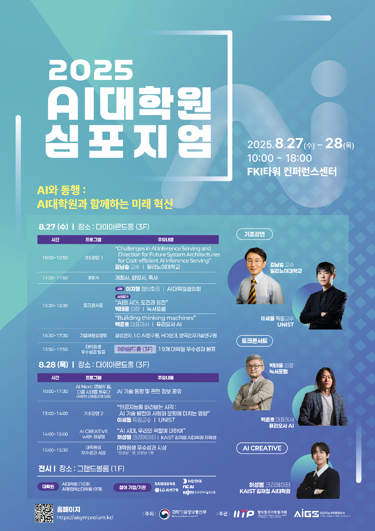 한편, 오늘 간담회가 열린 2025 인공지능 대학원 학술대회(심포지엄)는 “인공 지능과 동행 : 인공 지능 대학원과 함께하는 미래 혁신”이라는 주제로 8.27(수)∼28(목) 이틀간 개최된다. 과기정통부가 주최하고, (사)인공지능대학원협의회, 정보통신기획평가원이 공동 주관한다.